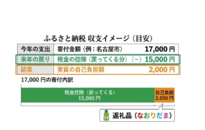 ※「なおりだま」の寄付金額(17,000円)が、このシミュレーションで出た「上限額」の範囲内であれば、自己負担2,000円のみで返礼品を受け取ることができます。
